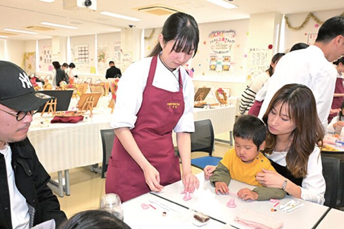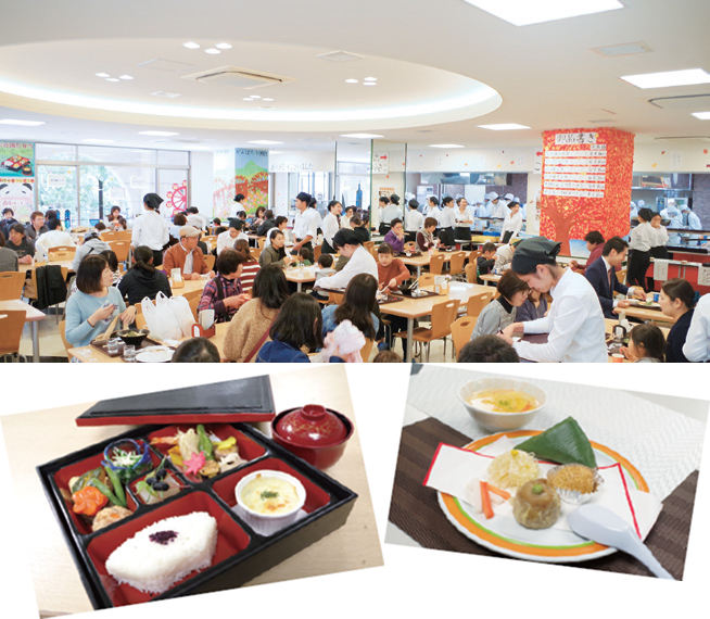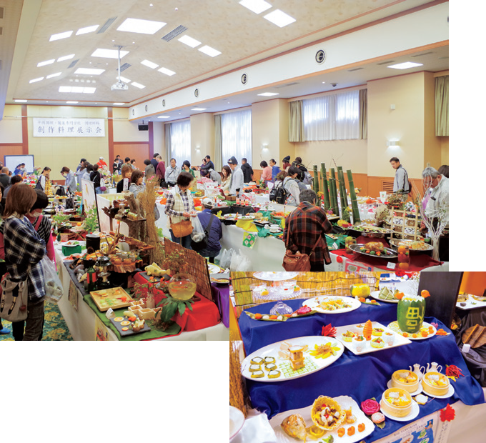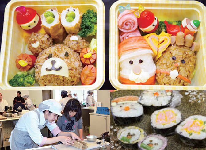 「飾り巻き寿司」や「キャラ弁」などの食育体験ができるコーナーです。毎年人気のうどん打ち、また「パンづくり体験」もできます。