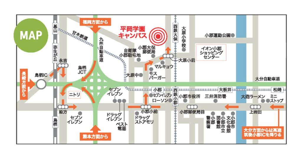 • 小郡大板井下車~(甘木鉄道甘木線/2分)~西鉄小郡駅~(西鉄大牟田線/約5分)~西鉄大保駅下車