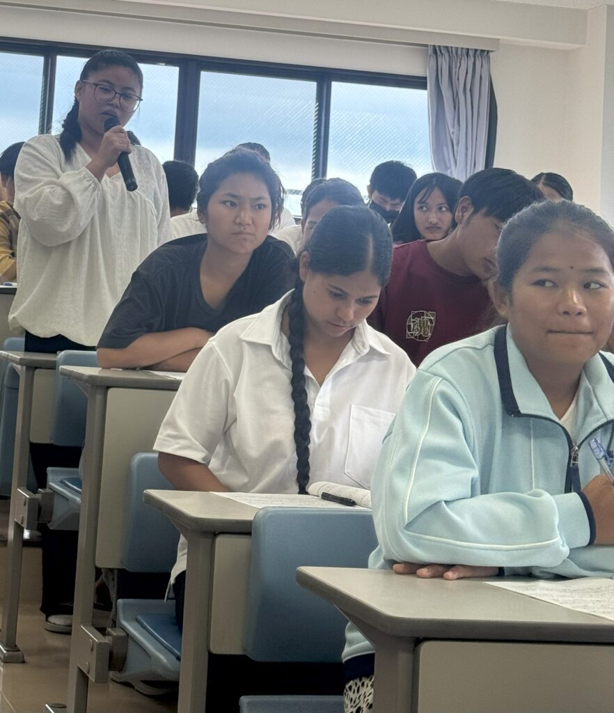 ▲ マイクを持って発表している学生:グルン マニサ(ネパール出身)