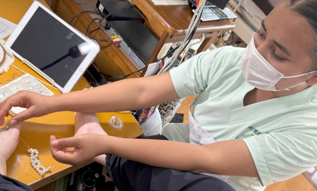 受持ちの利用者と「ビーズブレスレット」を作成中![]()