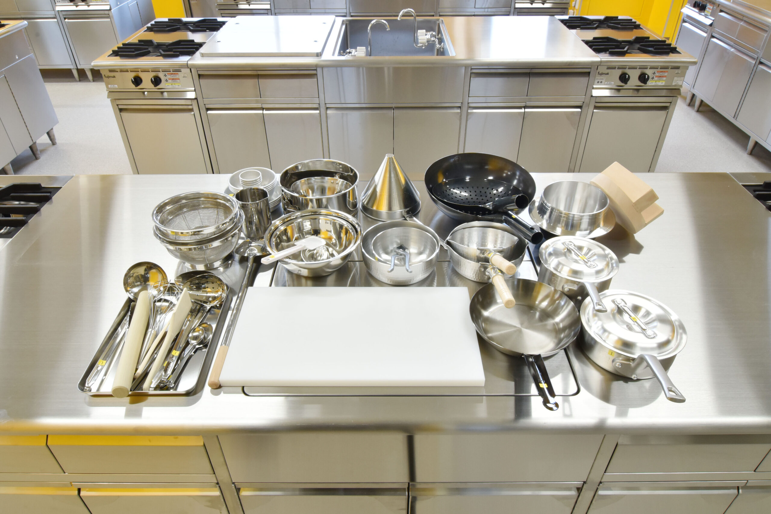 基礎調理実習では、1人1台の実習台で反復し、基礎を学びことで、基礎技術の完全習得を目指します!