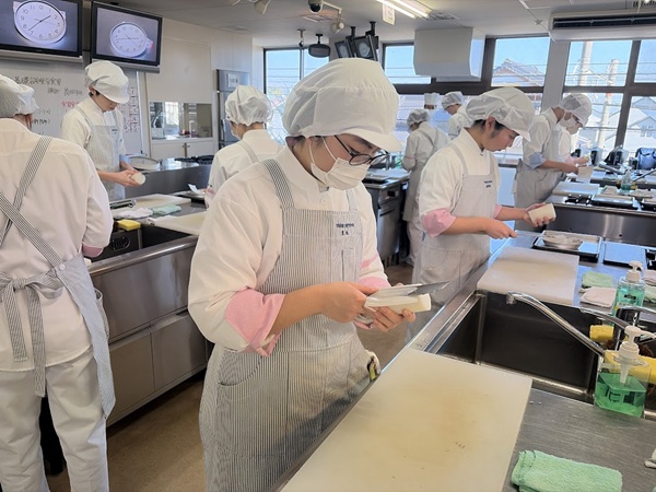 包丁の持ち方からスタートする「基礎調理学実習」があるので、初心者の方も2年間でプロの技術がしっかり身に付きますよ。
