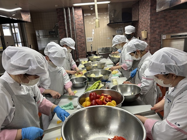 本校では、15人のチームで300食を作るという、より現場に近いスタイルで実習を行います。