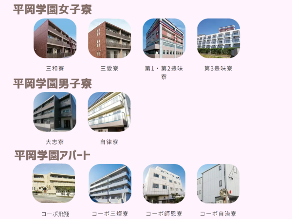 平岡学園は学園直営寮7棟(女子寮5棟、男子寮2棟)、直営アパート4棟を完備![]()
