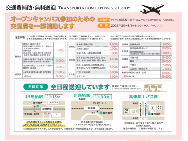 ※新3年生限定、バス運行日のお申し込みは交通費の補助がありません。福岡県小郡市、佐賀県三養基郡基山町、鳥栖市は支給対象外となります