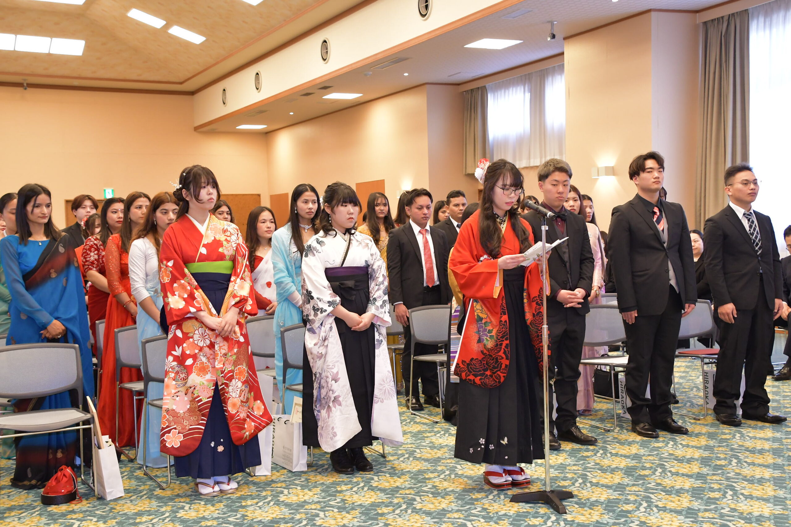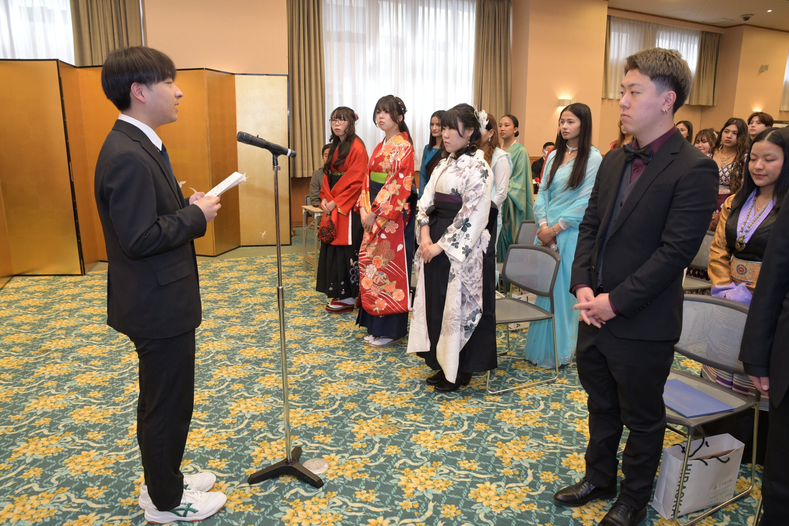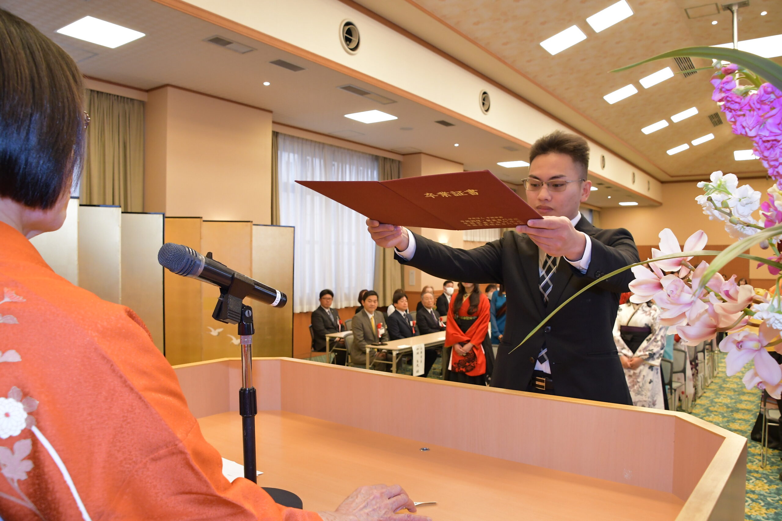 ▲総代は、小島 冠要さん(福岡県:朝倉高校/内定先:特別養護老人ホーム 宝生園)
