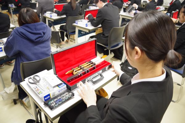 ▲プロ仕様の包丁にみんな興味津々です![]()